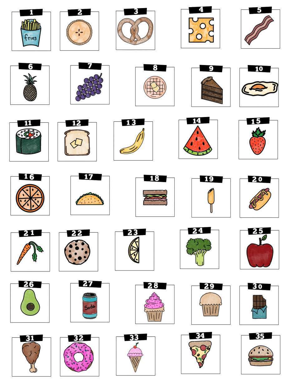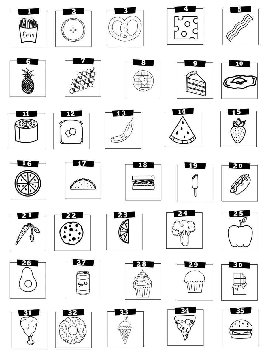 1-fries 2-pie 3-pretzel 4-cheese 5-bacon 6-pineapple 7-grapes 8-waffle 9-cake 10-fried egg 11-sushi 12-toast 13-banana 14-watermelon 15-strawberry 16-orange 17-taco 18-sandwich 19-corndog 20-hotdog 21-carrot 22-cookie 23-lemon 24-broccoli 25-apple 26-avocado 27-soda 28-cupcake 29-muffin 30-chocolate bar 31-chicken drumstick 32-donut 33-ice cream cone 34-pizza 35-hamburger