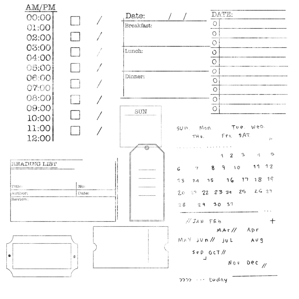 Here I’ve created 48 basic vintage stamps for journaling in procreate.